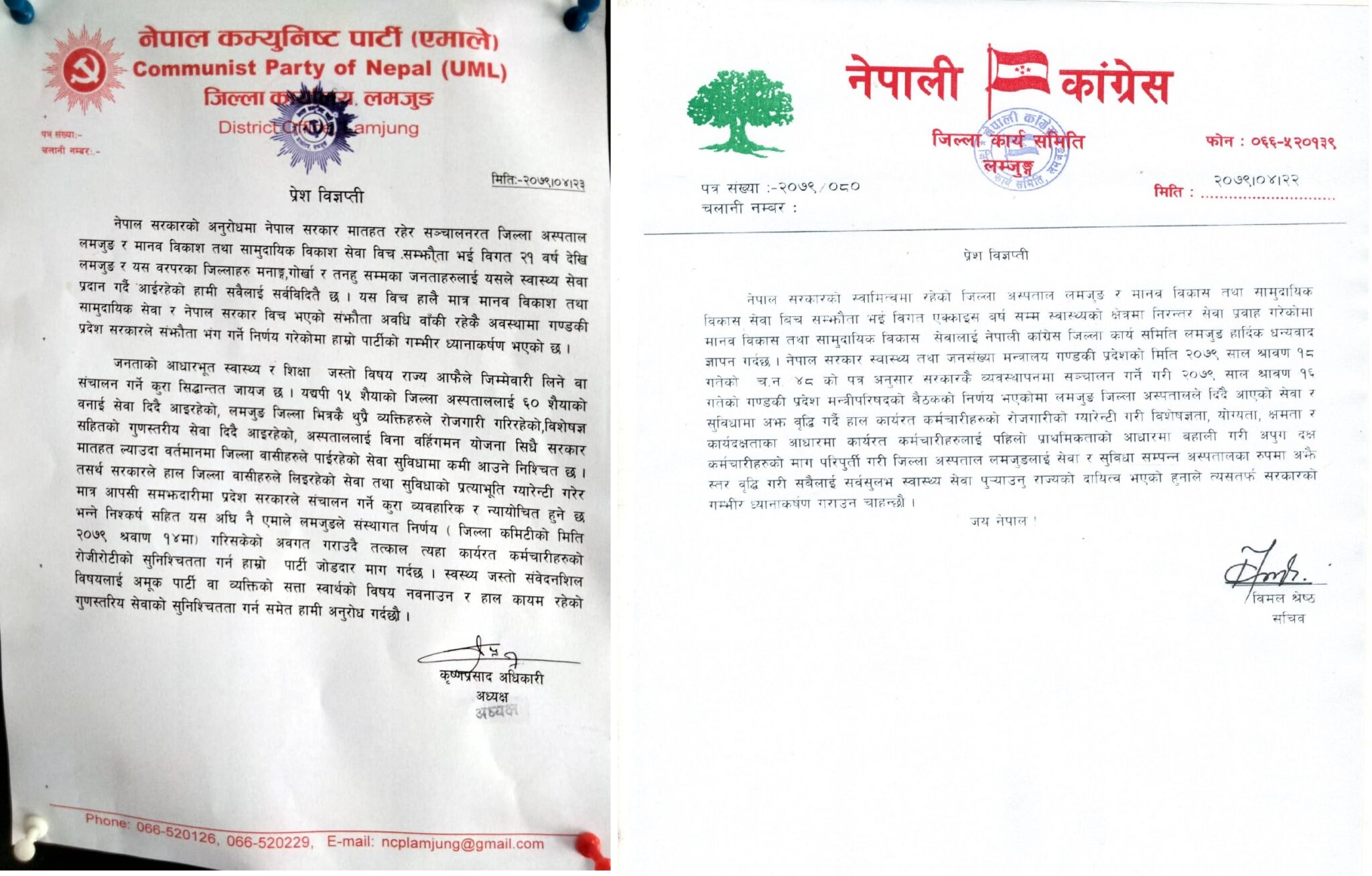 नेपाली काँग्रेस लमजुङ र नेकपा एमाले लमजुङले छुटछुट्टै विज्ञप्ती जारी गरी अस्पताल सम्झौताका विषयमा आधिकारिक प्रतिक्रिया दिएका हुन् ।