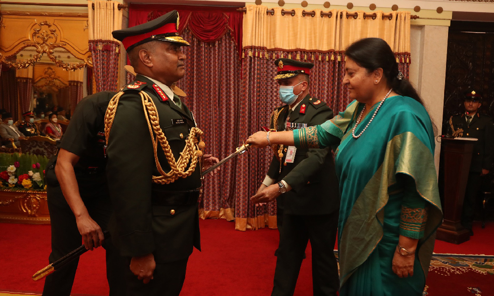 काठमाडौं । राष्ट्रपति विद्यादेवी भण्डारीले औपचारिक नेपाल भ्रमणमा रहेका भारतीय स्थल सेनाध्यक्ष मनोज पाण्डेलाई सोमबार मानार्थ महारथीको उपाधि प्रदान गरेकी छन् ।