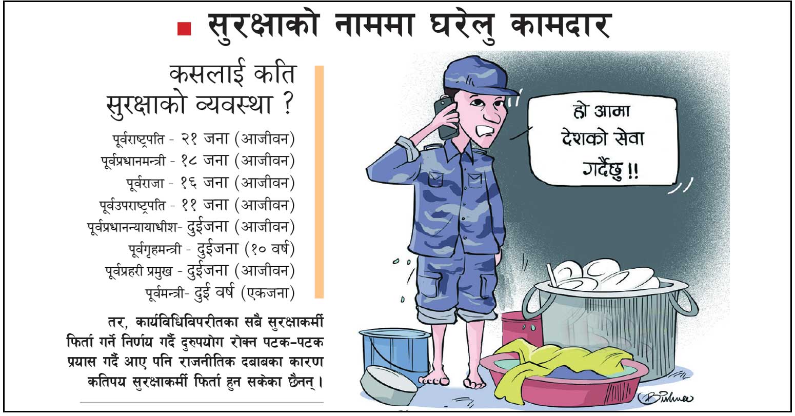दुई वर्षअघि गृहले लागू गरेको ‘विशिष्ट व्यक्तिहरूको सुरक्षा व्यवस्थापन कार्यविधि २०७७’ ले कसलाई कति सुरक्षाकर्मी दिने भन्ने तोकेको छ । पूर्वराष्ट्रपतिलाई २१, पूर्वप्रधानमन्त्रीलाई १८, पूर्वराजालाई १६, पूर्वउपराष्ट्रपतिलाई ११ र पूर्वप्रधानन्यायाधीशलाई दुई सुरक्षाकर्मी आजिवन उपलब्ध गराउने कार्यविधिमा उल्लेख छ । त्यस्तै, पूर्वगृहमन्त्रीले १० वर्षसम्म दुईजना, पूर्वप्रहरी प्रमुखले आजीवन दुईजना र पूर्वमन्त्रीले दुई वर्षसम्म एक सुरक्षाकर्मी पाउने व्यवस्था छ ।