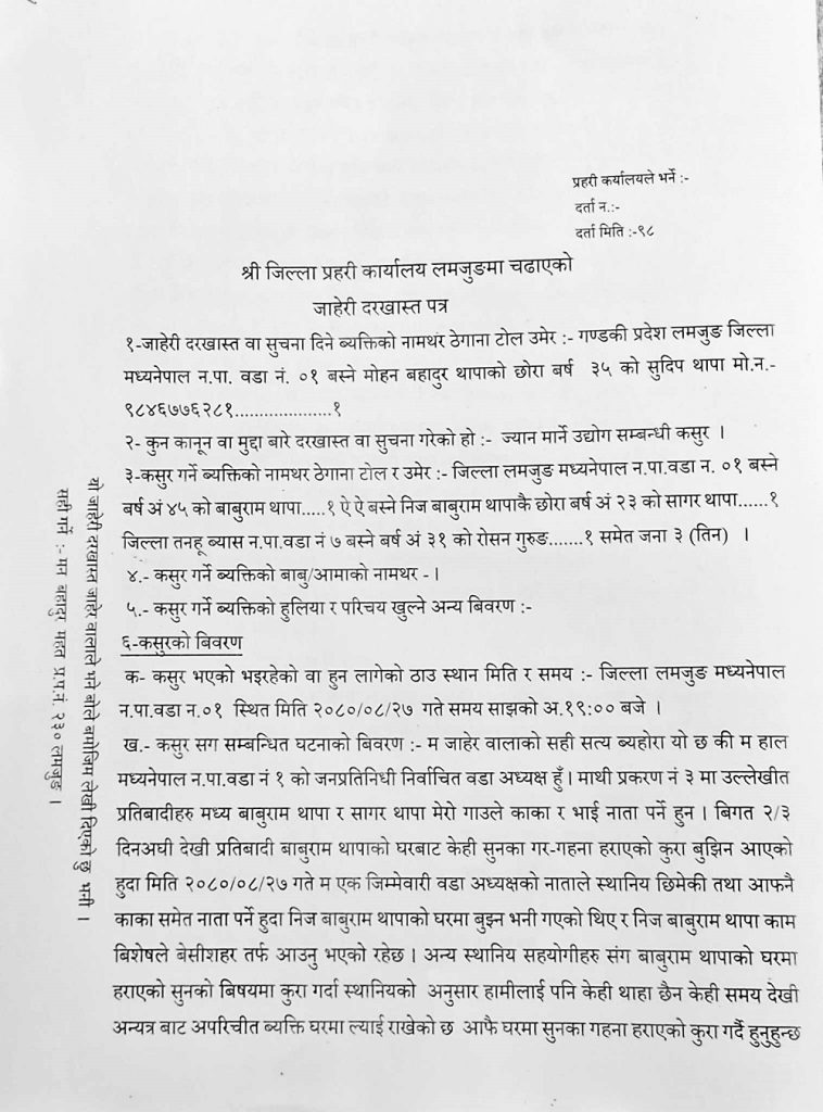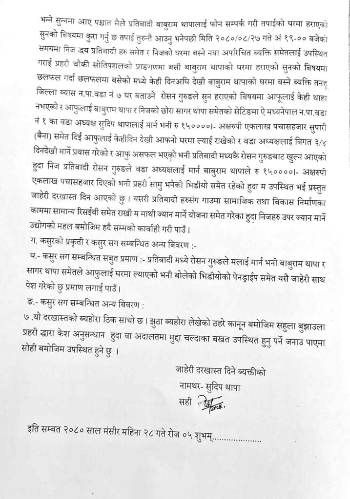 वडा अध्यक्ष थापाले प्रहरीमा दिएको जाहेरी :-