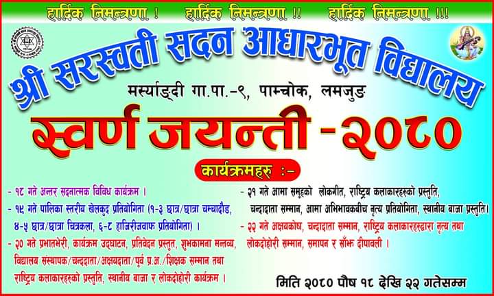 लमजुङ । मर्स्याङ्दी गाउँपालिकाकाे वडा नम्वर ९ मा रहेको सरस्वती सदन आधारभुत विद्यालयले स्वर्ण महोत्सव मनाउन भब्य तयारी गरेकाे छ । विद्यालय स्थापना भएको ५० वर्ष पुरा भएको अवसरमा विबिध कार्यक्रम सहित स्वर्ण महोत्सव मनाउन लागिएको हो ।