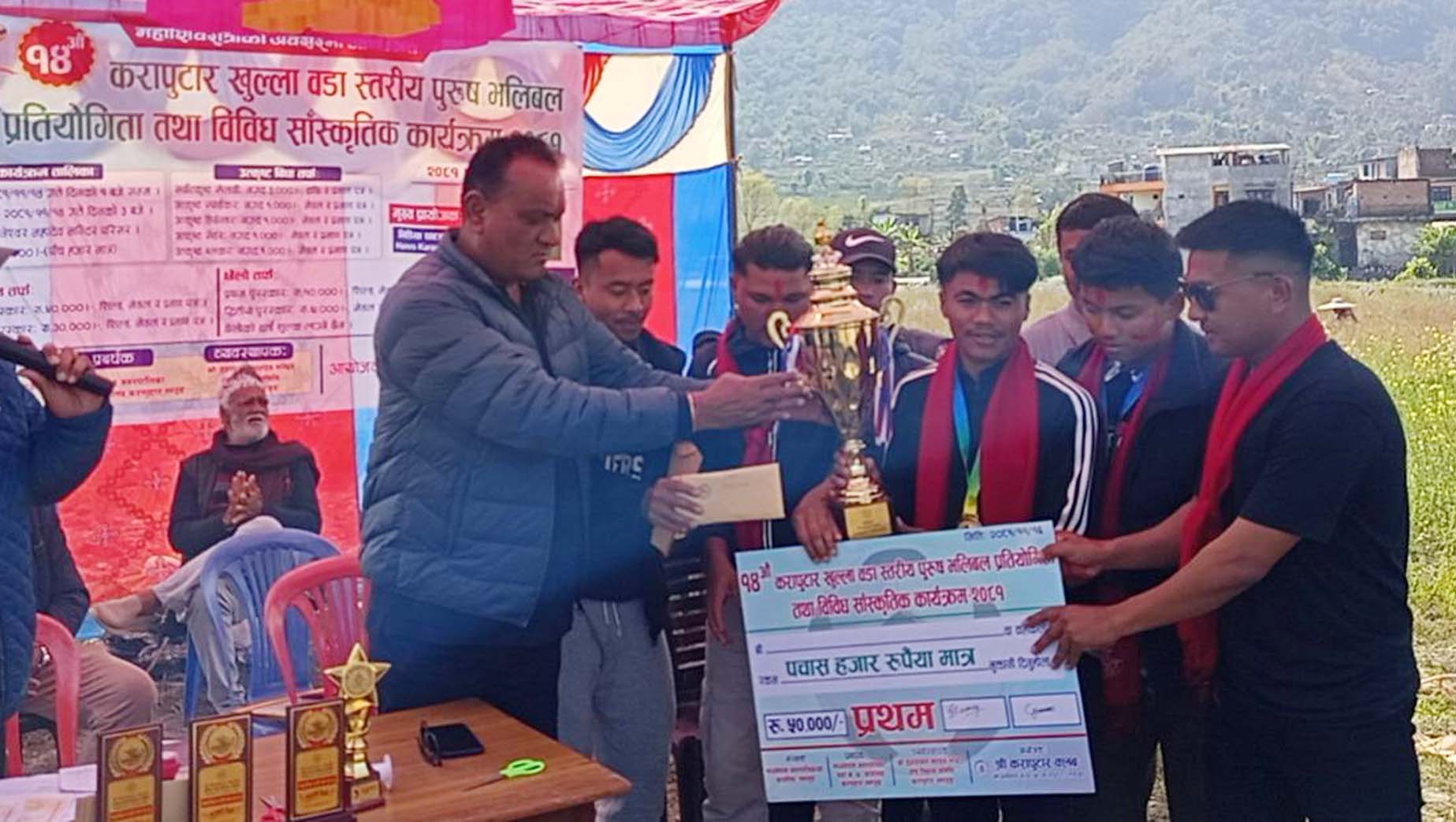 लमजुङ । मध्यनेपाल नगरपालिका–७ करापुटारमा आयोजित १४ औं करापुटार खुल्ला वडा स्तरीय पुरुष भलिबल प्रतियोगिताको उपाधि बिरुवा गाउँपालिका–२, स्याङ्जाले हात पारेको छ ।